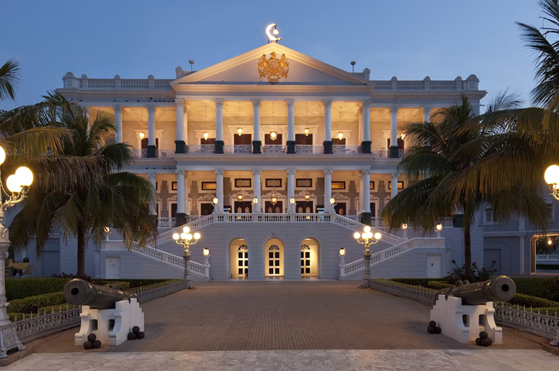 Located on a hilltop overlooking the city, Taj Falaknuma Palace is spread across 32 acres. Its Main Lawns can host around 1,200 guests, while the Pool Lawns and outdoor gardens accommodate up to 2,500 floating guests. Indoor spaces such as the Durbar Hall seat up to 150 guests. The palace has valet parking for around 300 cars and offers 60 rooms and suites. Every event here is managed with in-house catering and service that reflects its royal heritage.